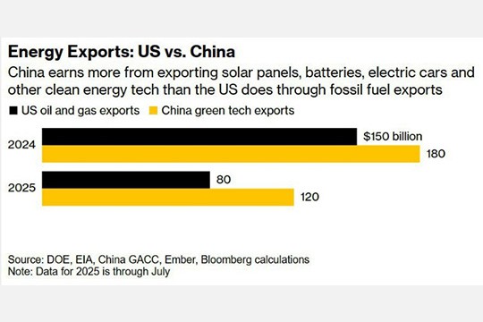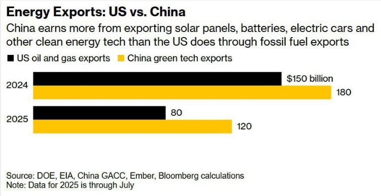 The US, which has positioned itself as a major fossil fuel exporter, sold $80 billion in oil and gas abroad through July, the last month with data available. China exported $120 billion in green technology over the same period.