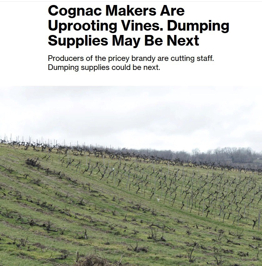 The vineyards of Cognac, sprawled across the rolling hills of southwestern France, are typically desolate in January. Once the grapes are harvested every fall and their juice is fermented and distilled to make the region’s namesake spirit, the area goes into hibernation. But this year, there are pockets of activity, with producers uprooting vines, the first coordinated removal since the late 1990s as the industry attempts to reduce production and revive a flagging market, Bloomberg reports