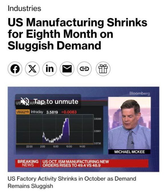 US factory activity shrank in October for an eighth straight month, driven by a pullback in production and tepid demand, Bloomberg reports.
