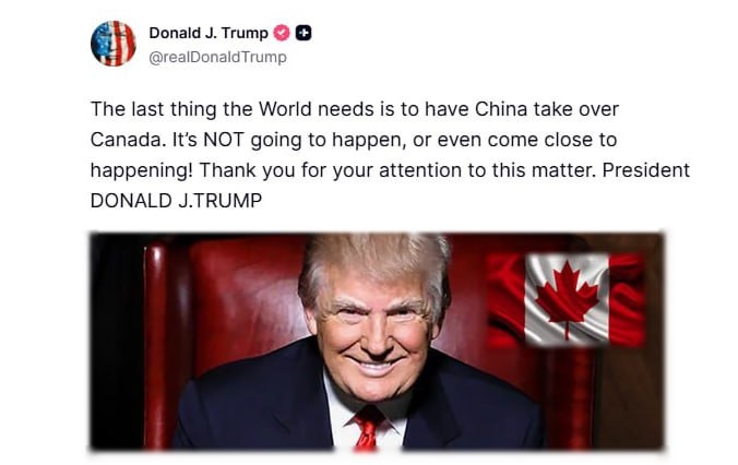 In a second post later Saturday, Mr. Trump said he would save Canada from being conquered by China.