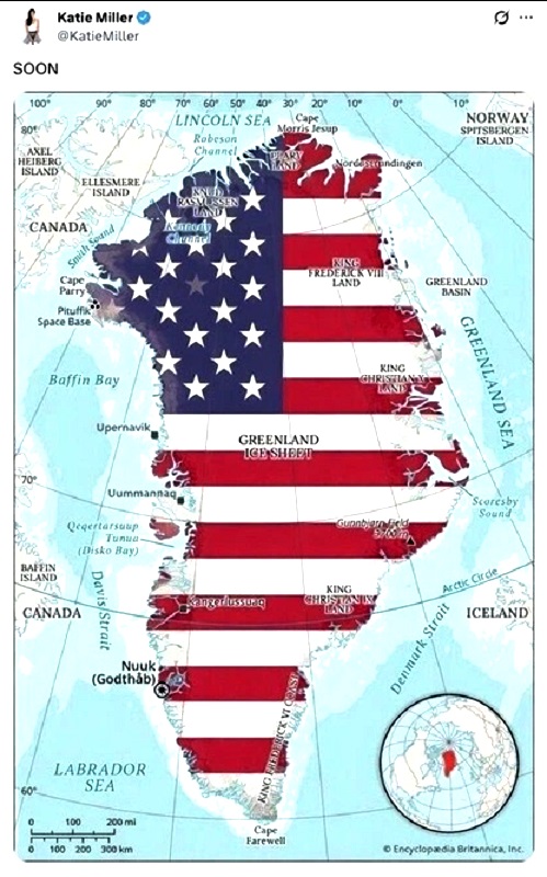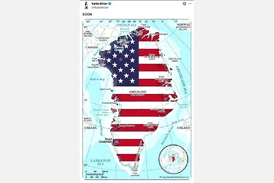 The wife of White House Deputy Chief of Staff Stephen Miller posted at Social Media a map of Greenland on social media, colored in the colors of the American flag. "Coming soon," she captioned her post.