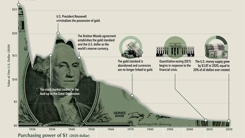 The value of a dollar in 2020 is much lower than it was in the early 20th century. Comparisons through the decades show what drove the dollar down.