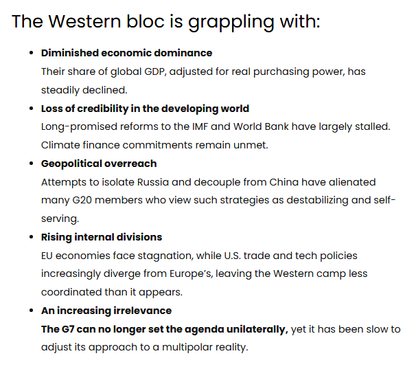 G7 members continue to push for dominance within the G20, seeking to preserve their long-standing hegemonic economic model despite its declining global relevance. The rise of the BRICS group has sharply challenged this outdated posture, exposing the imbalance inherent in Western-centric governance. Today, the G7 represents only about 28.4% of global GDP (PPP), a dramatic fall from nearly 50% in the 1980s and accounts for just 9.6% of the world’s population.