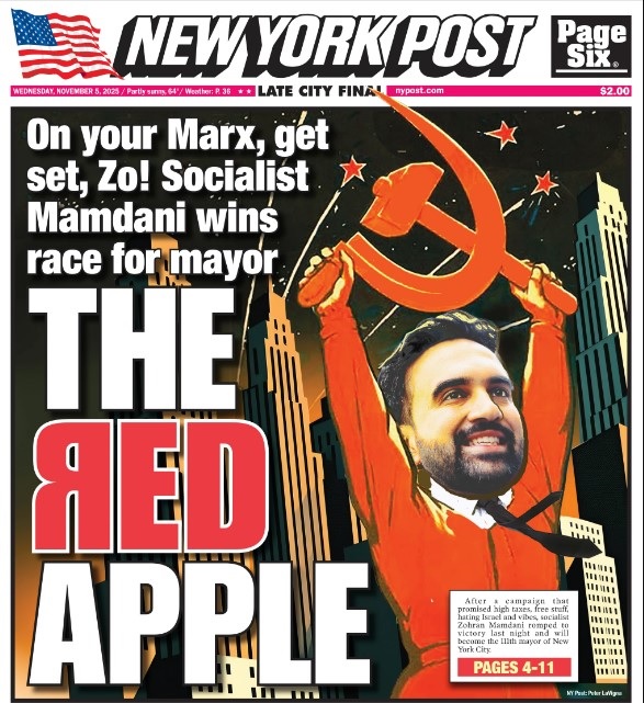 New Yorkers elected their first socialist mayor Tuesday, handing far-left Democrat Zohran Mamdani a historic victory — as he claimed a mandate for his potentially budget-busting progressive agenda and all but declared war on President Trump, ‘The New York Post’ stresses.