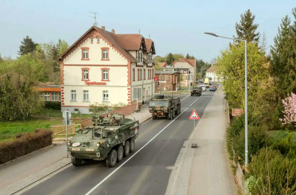 A convoy of U.S. military vehicles passed through Frankenberg, Germany, en route to Poland in 2024 for NATO exercises