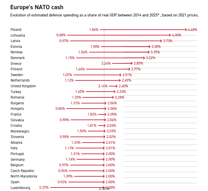 Evolution of estimated defense spending as a share of real GDP between 2014 and 2025, based on 2021 prices: