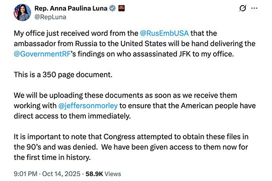 “I have received a hard copy of the report on JFK’s assassination from the Ambassador of Russia. A team of experts is enroute to my office in the morning to begin translation and full review of documents,” Luna wrote.