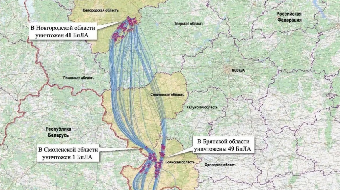 As the map shows, the enemy delivered the strike from several directions at the residence of the President of the Russian Federation over territory of Bryansk, Smolensk, Tver, and Novgorod regions by 91 unmanned aerial vehicles.