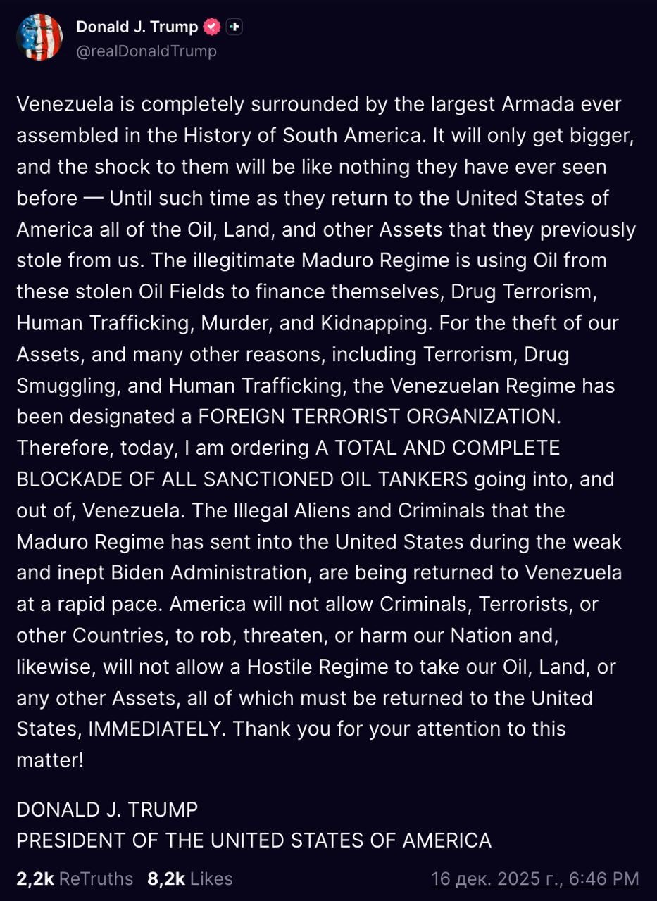 “Venezuela is completely surrounded by the largest Armada ever assembled in the History of South America. It will only get bigger, and the shock to them will be like nothing they have ever seen before — Until such time as they return to the United States of America all of the Oil, Land, and other Assets that they previously stole from us,” Trump said Tuesday night.