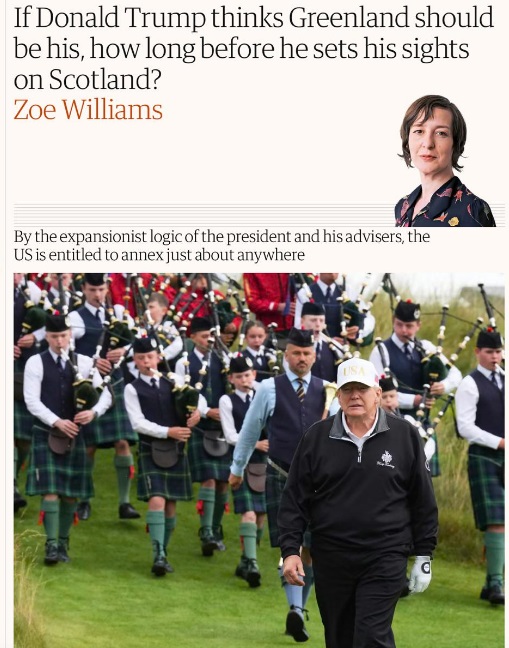 If you’re the kind of person who likes clicking on maps, you could spend an enjoyable half hour looking at which bits of the UK Trump could lay claim to, under his hemispheric approach: Norwich would be fine; Scotland would not. By the expansionist logic of the president and his advisers, the US is entitled to annex just about anywhere, writes frightened ‘The Guardian’.