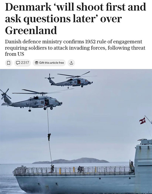 Danish defence ministry confirms 1952 rule of engagement requiring soldiers to attack invading forces, following threat from US, ‘The Telegraph’ reports.