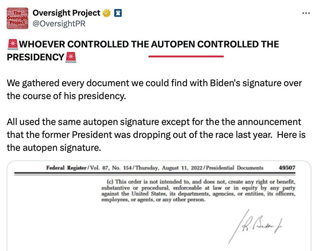 Mr. Trump previously ordered an investigation into the Biden White House's use of the autopen to sign presidential documents like pardons, claiming there was a "conspiracy" to "abuse the power of presidential signatures through the use of an autopen to conceal Biden's cognitive decline."