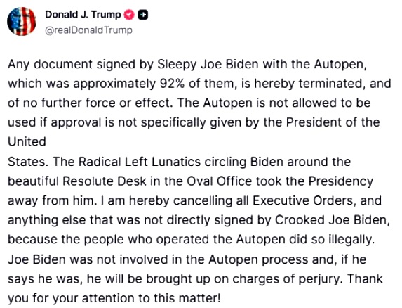 “Any document signed by Sleepy Joe Biden with the Autopen, which was approximately 92% of them, is hereby terminated, and of no further force or effect,” he wrote on Truth Social. “I am hereby cancelling all Executive Orders, and anything else that was not directly signed by Crooked Joe Biden, because the people who operated the Autopen did so illegally.”