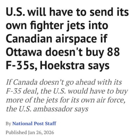 “The United States will have to send its own fighter jets into Canadian airspace unless Ottawa buys 88 F-35 fighter jets,” he said.