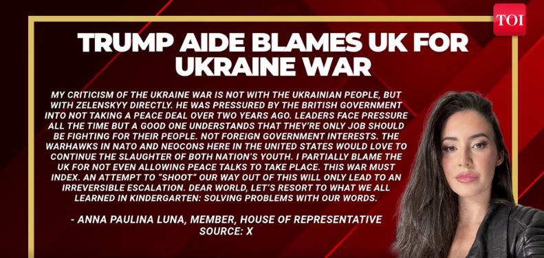 Anna Paulina Luna, a member of the US House of Representatives from the Republican Party from Florida, alleged that Zelensky was pressured by the British government to not take up the peace deal two years ago. Luna's remark seconds Slovakian prime minister Robert Fico's claim that ex-British premier Boris Johnson was very active in persuading Kyiv not to sign a peace agreement.