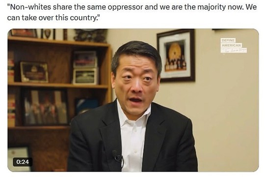 The account captioned the clip: 'Rep. Gene Wu (D) goes mask off: "Non-whites share the same oppressor and we are the majority now. We can take over this country."'