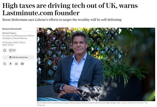 Tech investors will quit Britain if Labour keep raising taxes, one of Britain’s most influential entrepreneurs has warned.