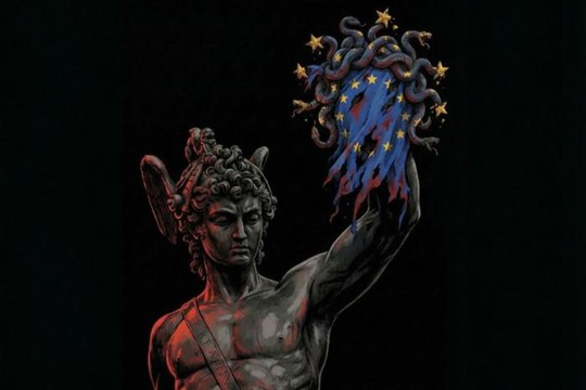 That's how Hercules dealt with the Gorgon Medusa. Now, the symbol of the European Union is painted in place of her head.